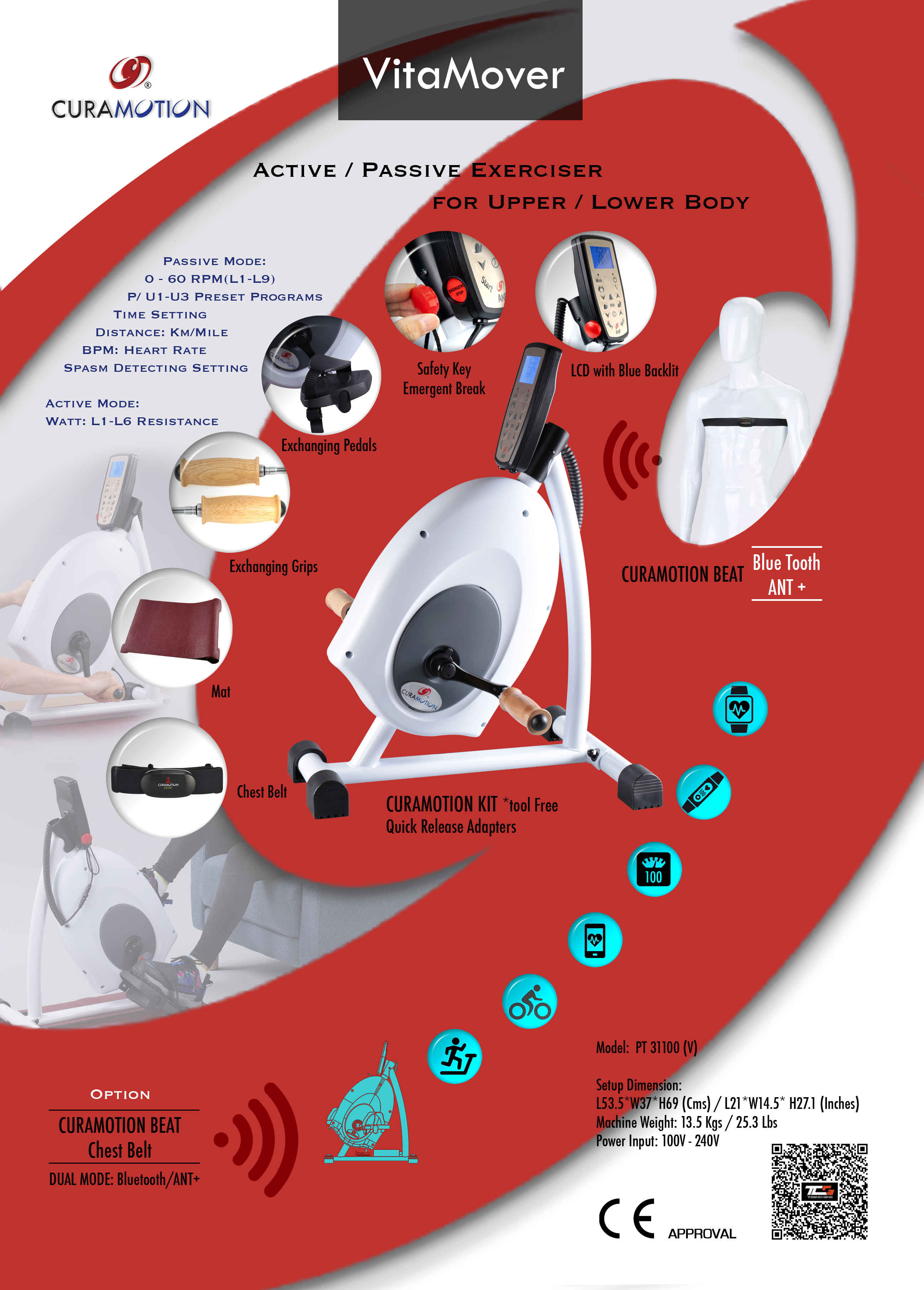- BPM: 無線心率接收模組(可選配 CURAMOTION Beat/藍牙胸帶)